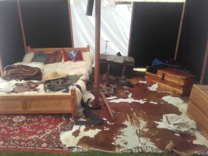 Stany mají samozřejmě i odpovídající interiér. Součástí ležení je např. přenosné ohniště, či dřevěné stoly a lavice.